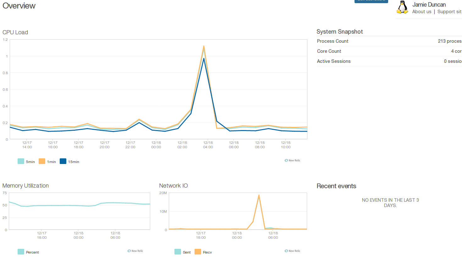 I quickly learned that one of the more interesting features with New Relic is that you can write your own plugin for just about anything. Essentially any data you can form into a JSON data and POST it to their API, you can record. There are some limitations (they only record data that you can graph, so just integers and floats), but it's a great idea, I think. That also means that your monitoring app's network bandwidth usage is nothing more than the size of those posts. So if you have a server and post 1000 characters once per minute, you have ~1K/minute per server of bandwidth usage.