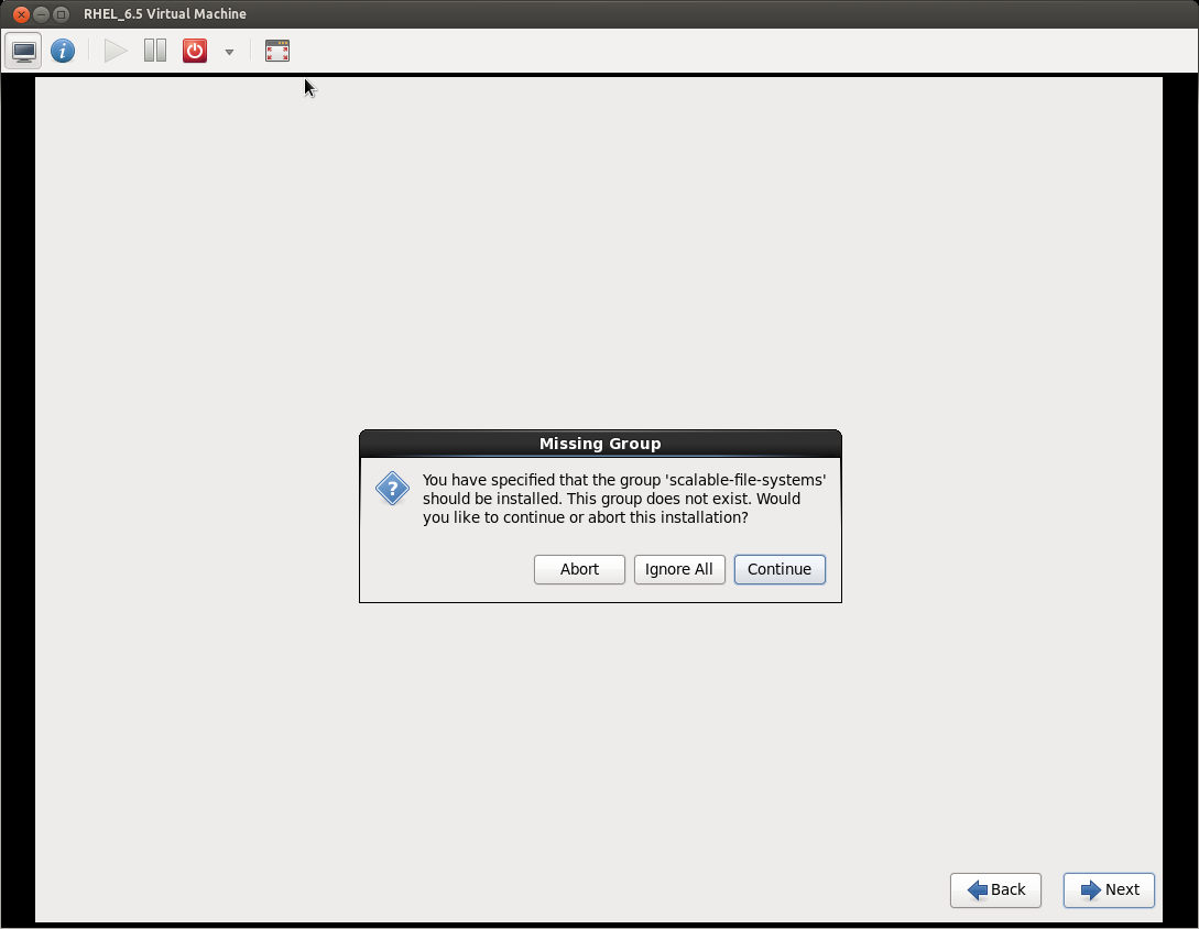 I have added the group 'scalable-file-systems' to my kickstart file. While installing using the kickstart file it says: "You have specified the group 'scalable-file-systems' should be installed. This group does not exist. Would you liike to continue or abort the installation?" does not exits.